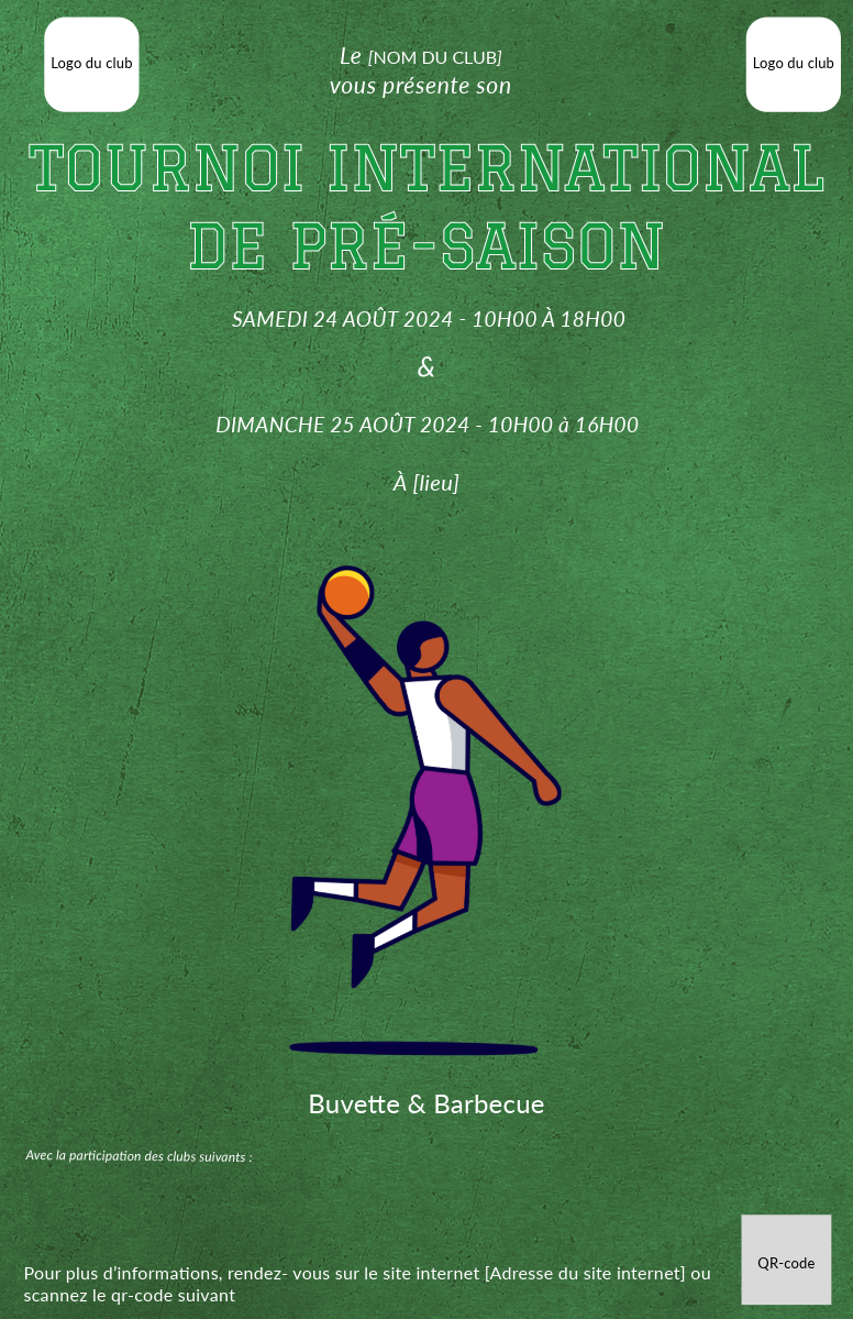 Je fais partie d'un club de basket et en début de saison, un tournoi international a été organisé. Ne voyant pas d'affiches créées sur les réseaux sociaux du club, j'ai essayé d'imaginer un visuel d'affiches qui pourraient être installées le jour du tournoi sur les valves d'informations dans la salle.