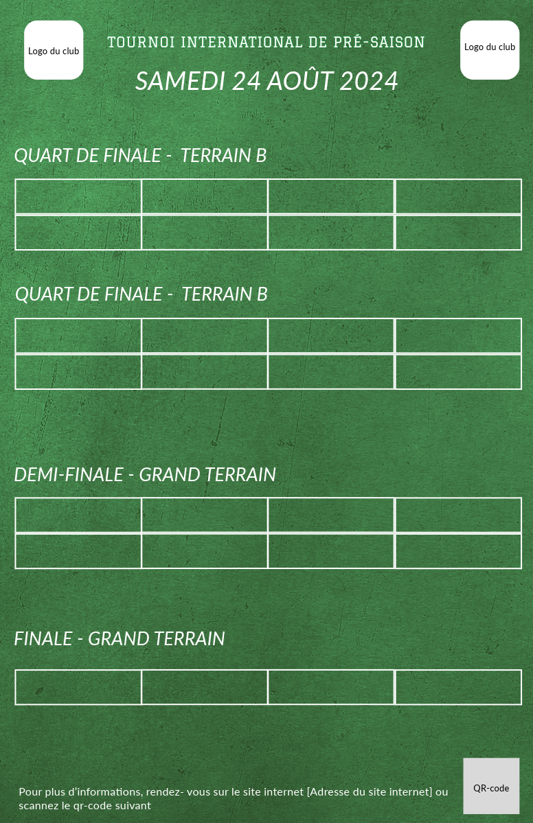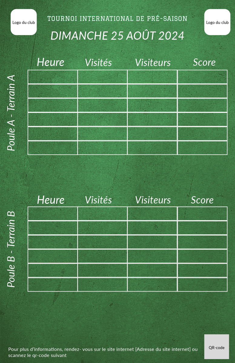 Les autres affiches reprennent des tableaux qui peuvent être complétés le jour même pour annoncer l'organisation des terrains ainsi que le déroulé de la journée et les scores.