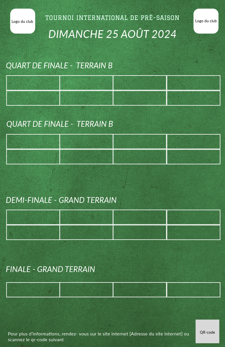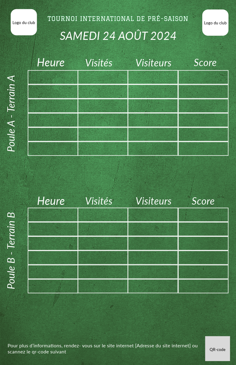 Les autres affiches reprennent des tableaux qui peuvent être complétés le jour même pour annoncer l'organisation des terrains ainsi que le déroulé de la journée et les scores.