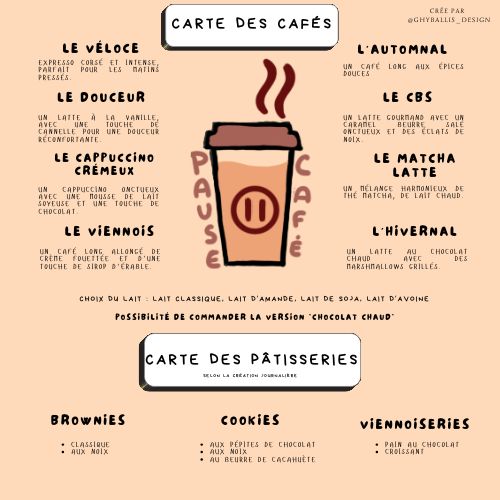 Les descriptifs des cafés et des pâtisseries ont été crées par Gemini AI. Le but de cette création était de se concentrer sur la conception visuelle de la carte et non sur l’élaboration du menu en lui-même.